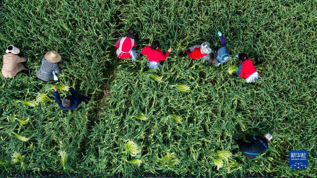 在成都市溫江區(qū)永寧街道八角社區(qū),農民在蒜稻輪作田里采收蒜薹(3月23日攝,無人機照片)。新華社記者 沈伯韓 攝