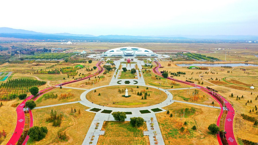 10月7日,空中俯瞰內蒙古少數(shù)民族群眾文化體育運動中心。